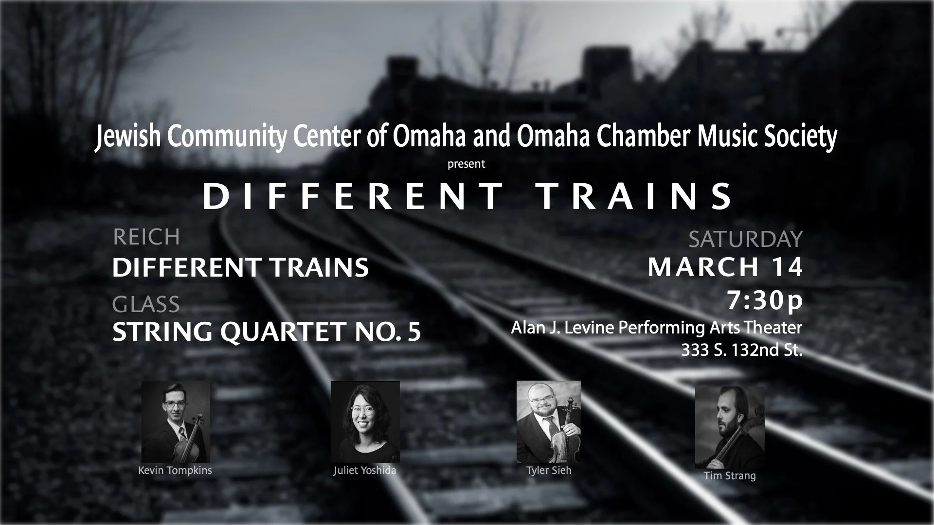 Different Trains—A visceral experience that takes you on three different journeys—from childhood reminiscences of carefree train rides, to a harrowing recollection of transports to concentration camps, to postwar survivors traveling to America—created by the celebrated Jewish-American composer Steve Reich. This breathtaking multi-media concert performed by virtuoso members of the Omaha Chamber Music Society will live in your memory long after the final chords have faded into the distance.